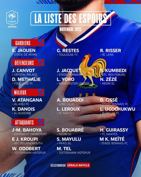 11月6日讯 法国U21最新一期名单公布,特尔、约罗、乌戈丘库、奥多贝尔、马尤卢等球员入选。 法国U21本月将干预2027年U21欧洲杯预选赛,先后对阵瑞士U21、法罗群岛U21。 法国U21名单: 门将:贾万(兰斯)、雷斯特斯(图卢兹)、雷瑟(朗斯) 后卫:坎沃(水晶宫)、雅奎特(雷恩)、昆贝迪(沃尔夫斯堡)、梅塔利(图卢兹)、约罗(曼联)、泽泽(新将来城体育) 中场:阿坦加纳(吉达国民)、布阿迪(里尔)、德贾伊-西塞(雷恩)、达努瓦(欧塞尔)、勒鲁(南特)、乌戈丘库(伯恩......查看更多