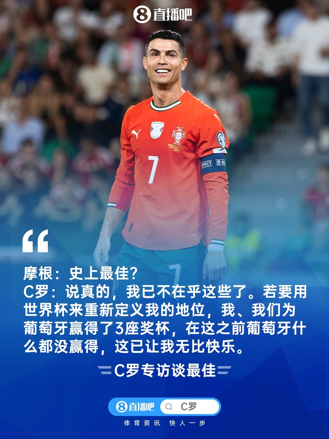 C罗:说确凿,我已不在乎这些了。看过太多访谈,当今无论我说什么都不会让东谈主诧异,事实自己就能讲明一切。