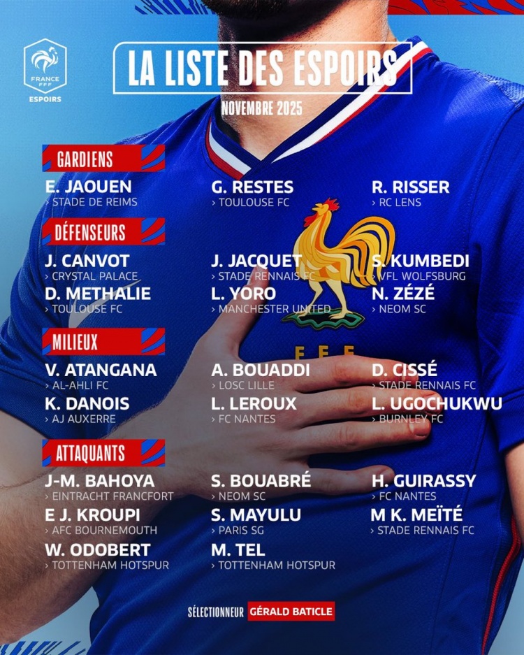 11月6日讯 法国U21最新一期名单公布,特尔、约罗、乌戈丘库、奥多贝尔、马尤卢等球员入选。