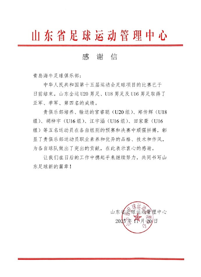 近日,山东省足球剖释处分中心向青岛海牛足球俱乐部发来感谢信,俱乐部培养、运送的5名球员宫睿聪、郑传辉、胡梓宇、江宇涵、田家豪在中华东说念主民共和国第十五届剖释会足球花样中为山东男足作念出了超过孝敬。