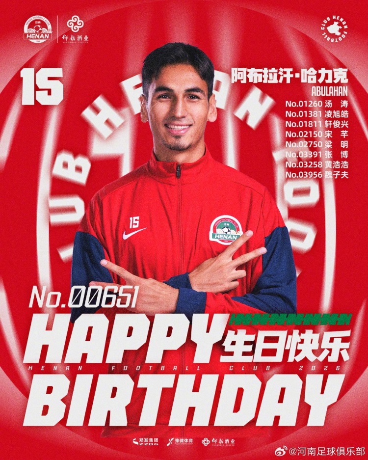 今天是河南队球员阿布拉汗及8名官方会员的生日,生日快乐!