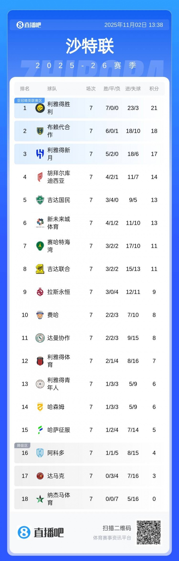 此役事后卫冕冠军吉达聚首排行沙特联第8,本赛季他们的领路很一般,上赛季的大腿本泽马缺席多场比赛。