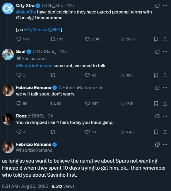 多纳鲁马来回有变?被曼城球迷喷是骗子,罗马诺酬劳:爱信不信
