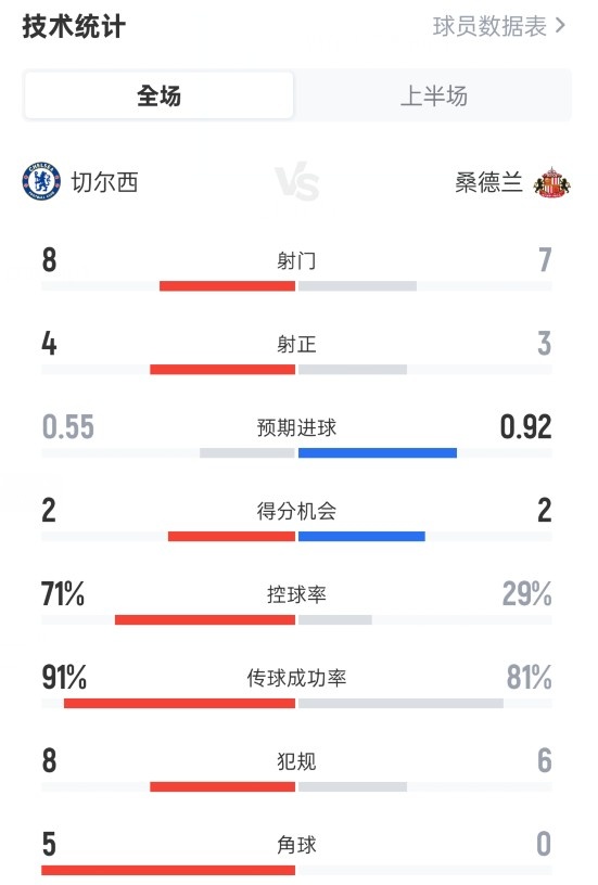 切尔西半场1-1桑德兰数据:射门8-7,射正4-3,控球率71%-29%
