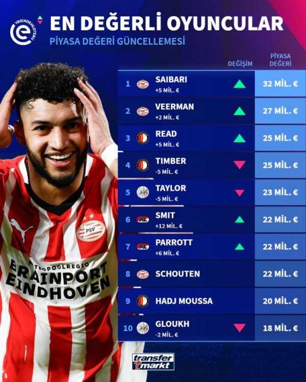 12月3日讯 荷甲球员德回身价更新,德转列出了最新的球员身价排行。 荷甲球员身价排行: 塞巴里(埃因霍温)——3200万欧元 威尔曼(埃因霍温)——2700万欧元 吉瓦罗·雷德(费耶诺德)——2500万欧元 昆滕·廷伯(费耶诺德)——2500万欧元 泰勒(阿贾克斯)——2300万欧元 斯米特(阿尔克马尔)——2200万欧元 帕洛特(阿尔克马尔)——2200万欧元 斯豪滕(埃因霍温)——2200万欧元 哈迪·穆萨(费耶诺德)——2000万欧元 格洛赫(阿贾克斯)——1800万欧......查看更多