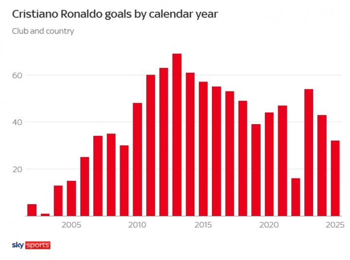 2025年,C罗如故在俱乐部和国度队攻入32球,自2010年以来,C罗平均每年进球数卓越50个,已往15年里,他的年度总进球数只消一次低于39个。那是在2022年,那一年他攻入了16粒进球。