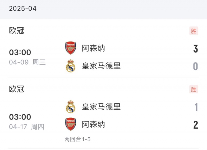 马德里之王!阿森纳上赛季总比分5-1双杀皇马,当天4-0大捷马竞