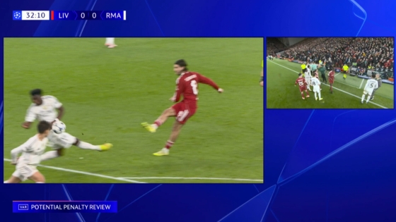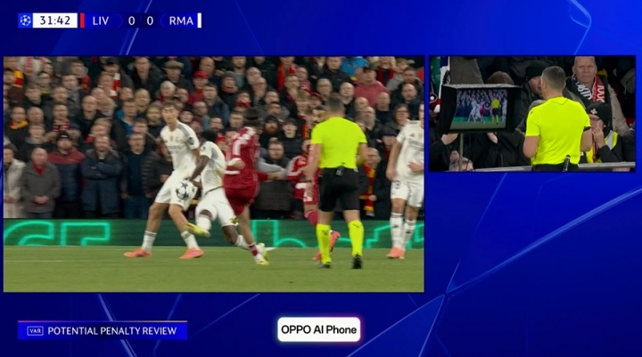 11月05日讯 利物浦vs皇马第31分钟,索博扣门击中琼阿梅尼手臂,裁判查验点球,VAR介入。