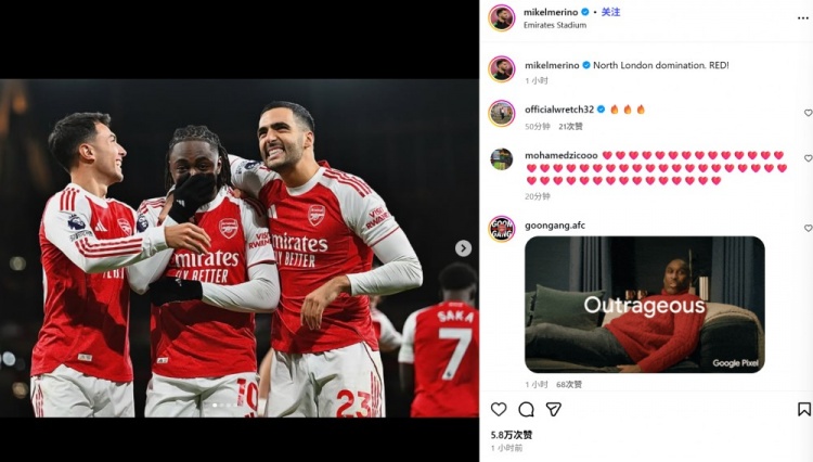精妙挑传送助攻!梅里诺社媒晒庆祝照:红色总揽北伦敦!