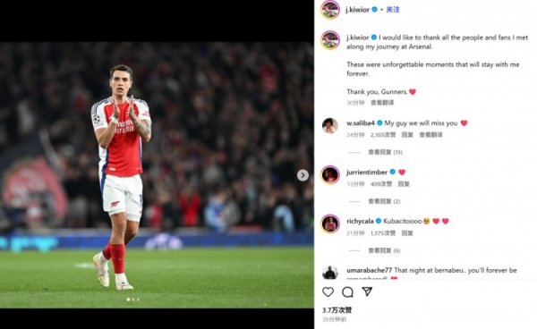 基维奥尔社媒告别阿森纳:感谢遭遇的通盘东谈主,我将永远铭刻在心