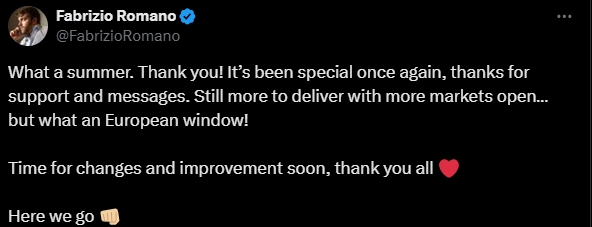 冬窗相逢!夏窗崇拜关窗,罗马诺感谢球迷:铭刻的夏天,谢谢环球