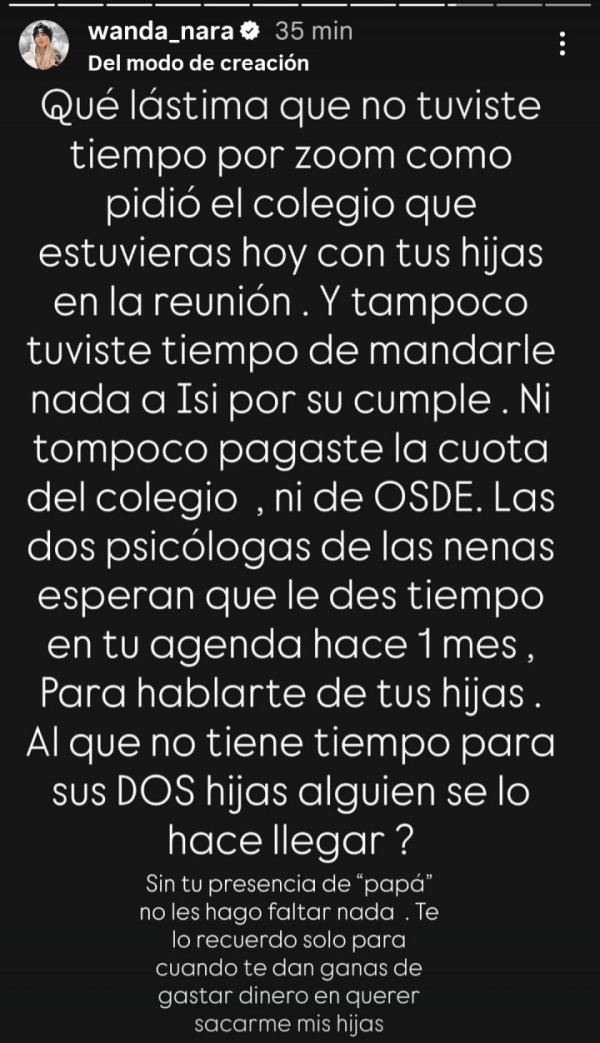 11月01日讯 伊卡尔迪前妻旺达·娜拉贯穿更新两条社媒社媒,品评伊卡尔迪对待孩子的活动。 旺达:真可惜,你没能按学校条目插足今天的线上家长会,和男儿们一谈通过Zoom(视频会议软件)参会。你也没技艺给伊西送任何生辰礼物。学校的用度、医疗保障的用度你也齐没交。男儿们的两位情态医师一个月前就希望你能在日程中留出技艺,和她们聊聊你的男儿们。对我方的两个男儿齐没技艺的东谈主,需要有东谈主领导他吗?莫得你这个‘爸爸’的存在,我也不会让她们缺任何东西。我领导你,这仅仅为了驻防你哪天念念用......查看更多