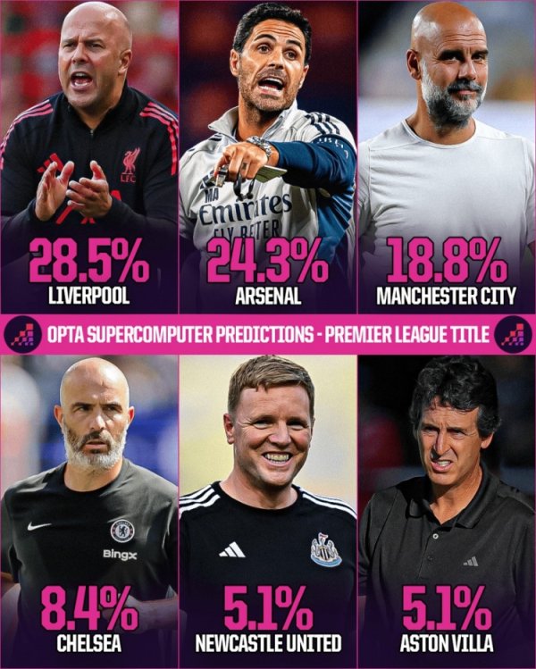 Opta量度英超冠军包摄概率:利物浦28.5%,枪手24.3%,曼城18.8%