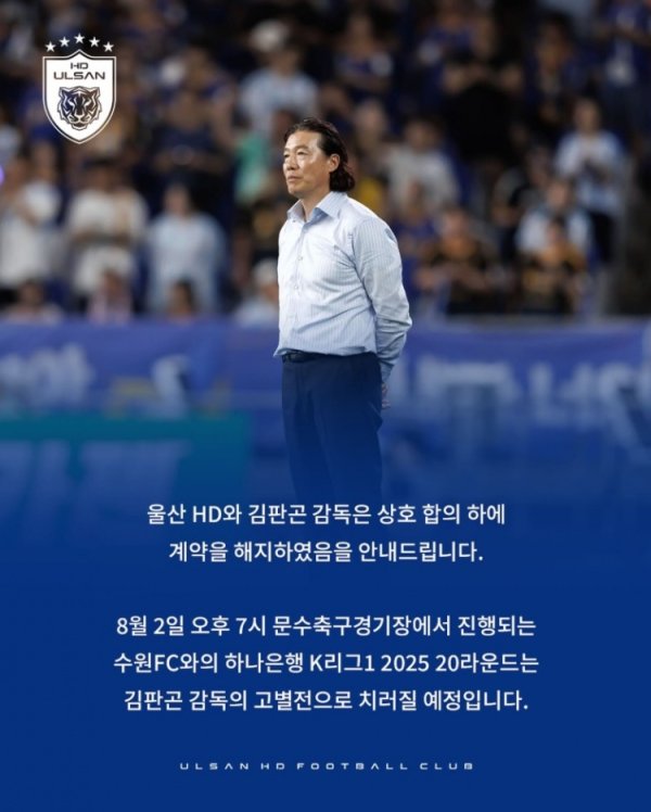 官方:蔚山HD与主帅金判坤协商一致打消契约