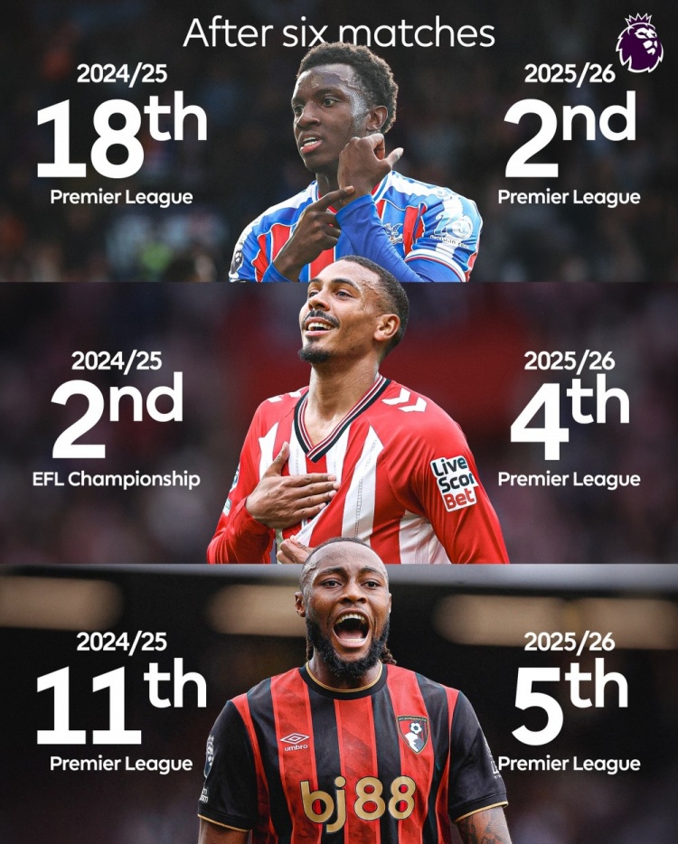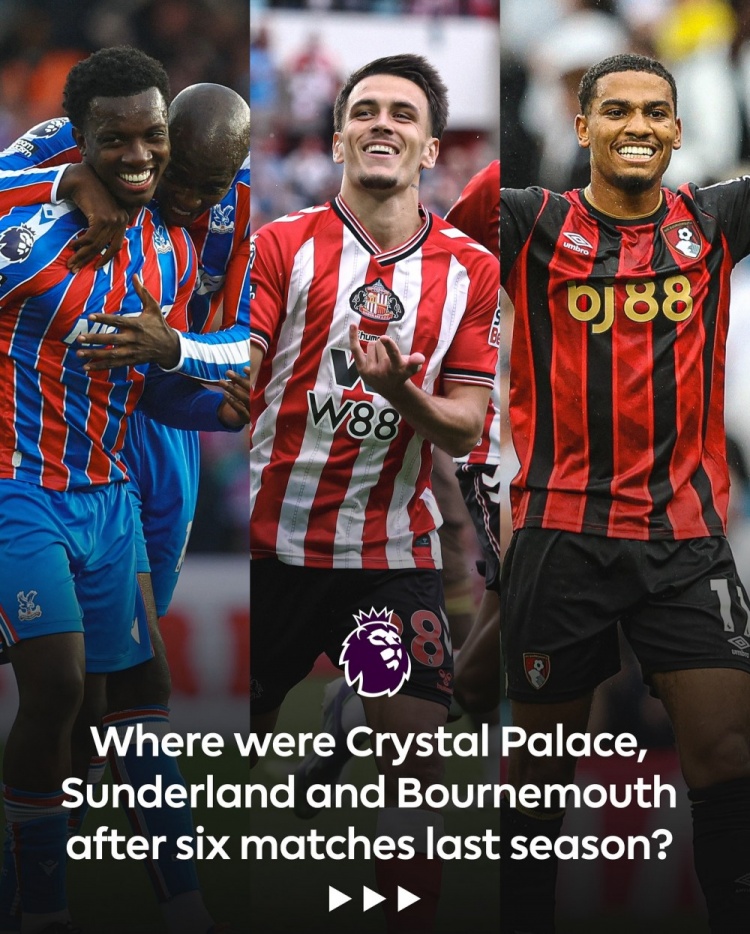 9月28日讯 英超官方更新社媒动态,赞赏水晶宫、桑德兰、伯恩茅斯本赛季的发扬。