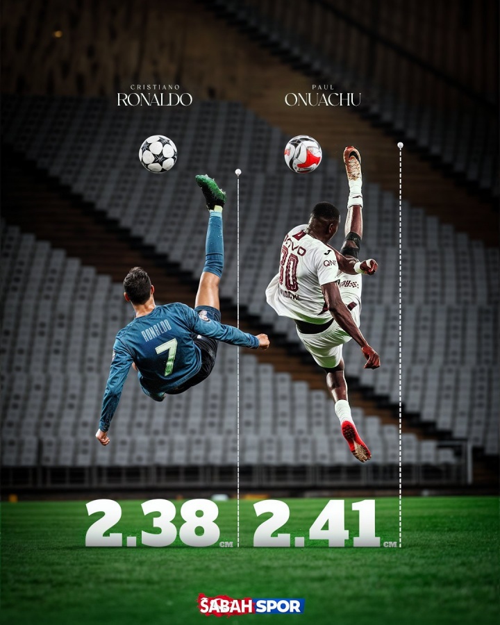 身高2.01米的奥努阿楚,日前打进一粒精彩的倒钩进球,触球点高度达2.41米。往日C罗的天秀倒钩触球点高度为2.38米。
