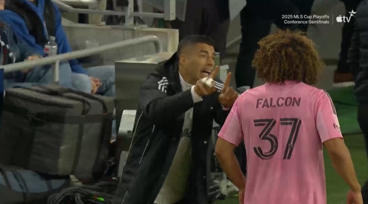 比赛第24分钟,转播镜头给到场下本日替补的苏亚雷斯,他叫来本队的首发中卫法尔肯,似乎是在向后者濒临面传授素养。