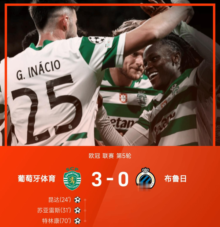 25/26赛季欧冠联赛第5轮,葡萄牙体育主场迎战布鲁日。本场比赛,昆达和苏亚雷斯齐完成传射,特林康的破门锁定胜局。最终全场比赛范围,葡萄牙体育3-0驯服布鲁日。