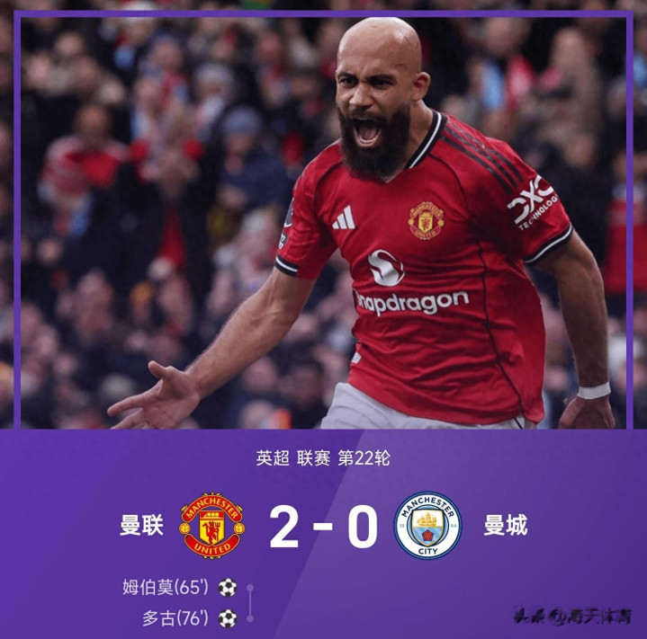1月17日 25/26赛季英超联赛第22轮,曼联2-0投诚曼城。全场比赛,姆伯莫、多古破门立功;马奎尔击中横梁,阿马德中柱;阿玛德、B费、芒特三东谈主进球被吹。最终曼联2-0完胜曼城。本场比赛事后,曼联积35分暂时升到联赛第四,曼城积43分依旧排在联赛第二,先赛一场的情况下降后阿森纳6分。