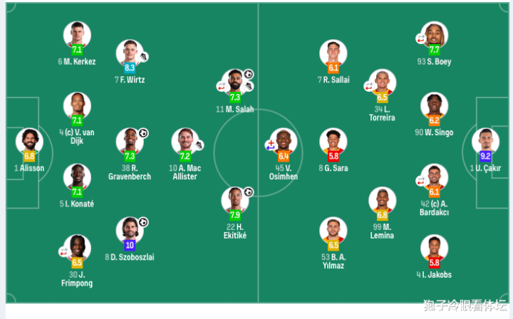 利物浦出场常客阵容:1-阿利松、4-范戴克、5-科纳特、30-弗林蓬(67’17-柯蒂斯·琼斯)、6-凯尔凯兹、38-赫拉芬贝赫(89’42-尼奥尼)、8-索博斯洛伊、10-麦卡利斯特、11-萨拉赫(74’18-加克波)、7-维尔茨(89’73-恩古莫哈)、22-埃基蒂克(89’14-基耶萨)