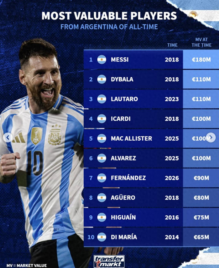 北京时间3月31日,德国转会市场网站发布了阿根廷球员历史身价最高榜单,这份榜单统计了阿根廷足坛所有球员职业生涯的身价峰值,完整呈现了不同时代阿根廷球星的市场价值巅峰期 。