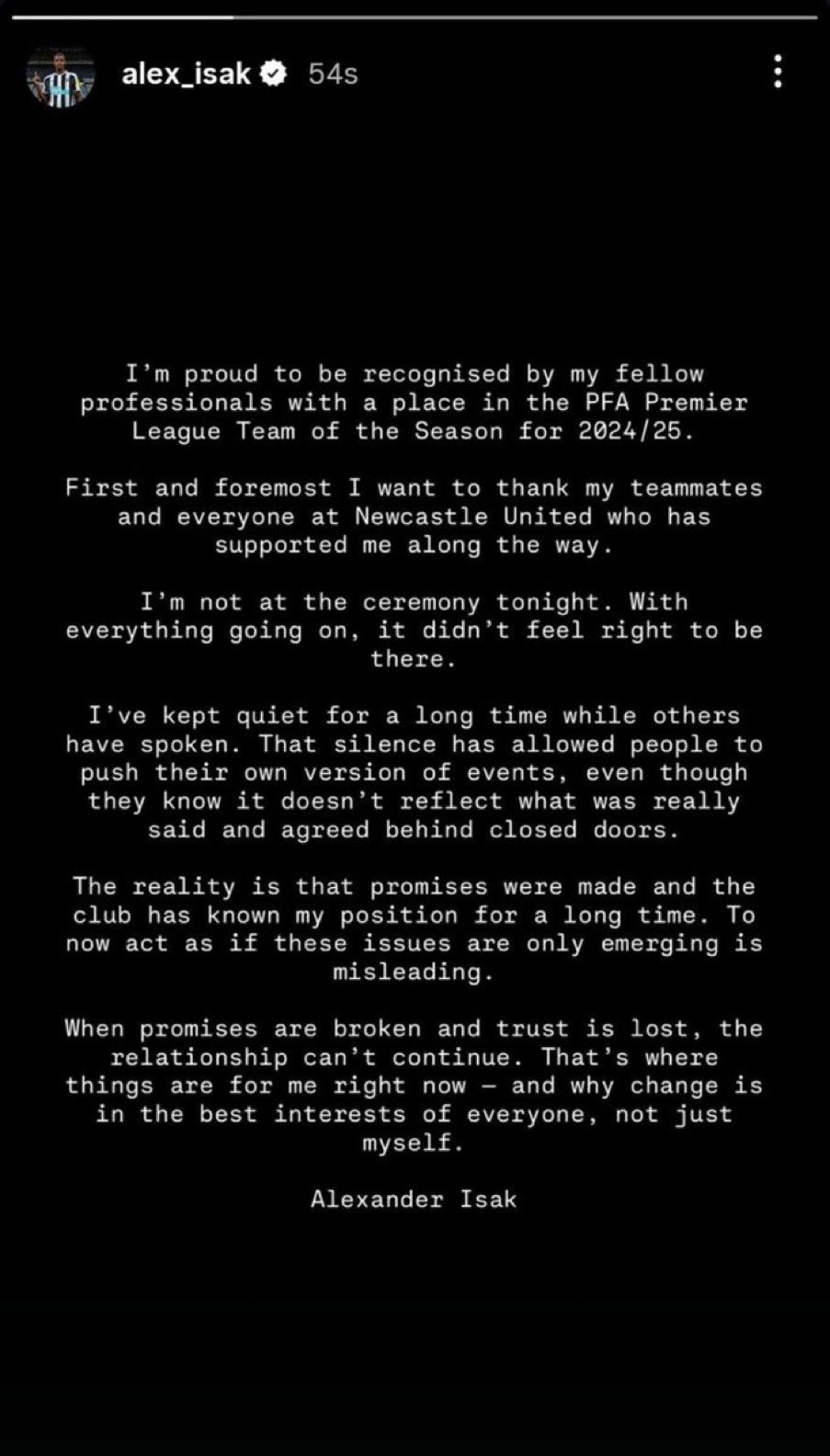 上赛季的英超银靴、纽卡斯尔的瑞典先锋社媒发表声明,并对莫得出席PFA授奖庆典,并对我方的转会传奇作念出了评释。