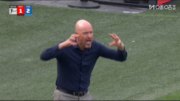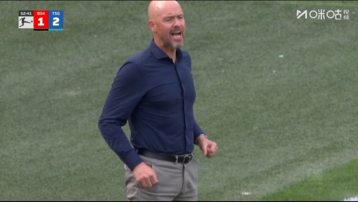 08月23日讯 德甲首轮,勒沃库森vs霍芬海姆,比赛第53分钟,霍芬海姆再入一球,勒沃库森连丢两球1-2遭反超,主帅滕哈赫在场边特地发火。