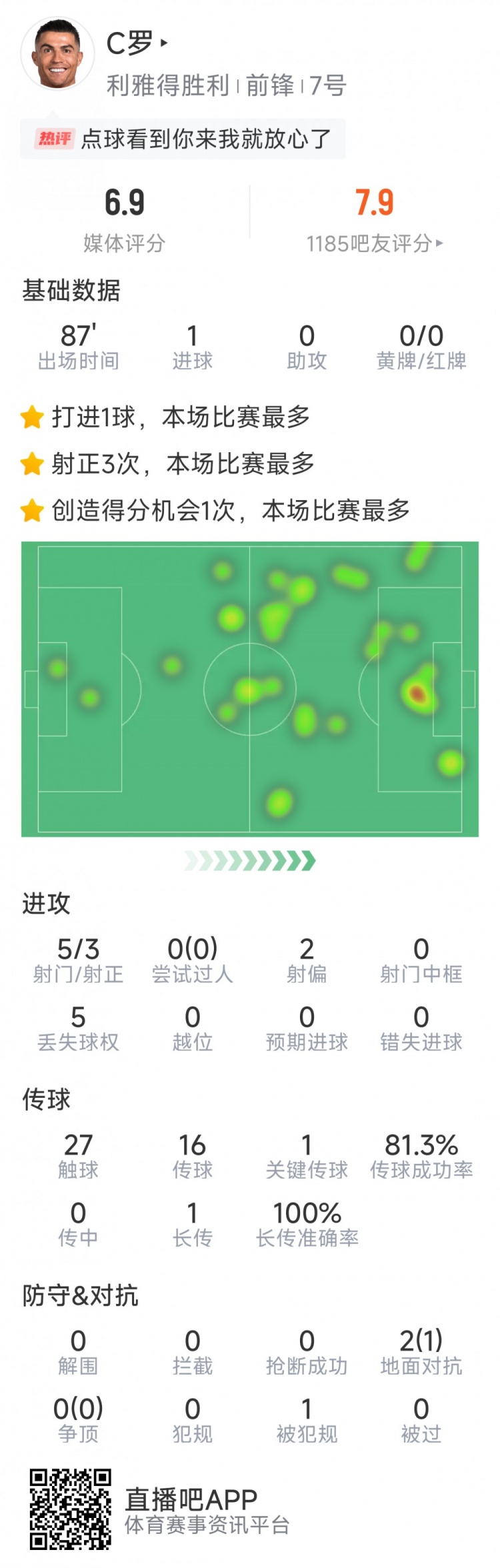 C罗本场数据:点射破门迎到手生存百球,5射3正,1要道传球