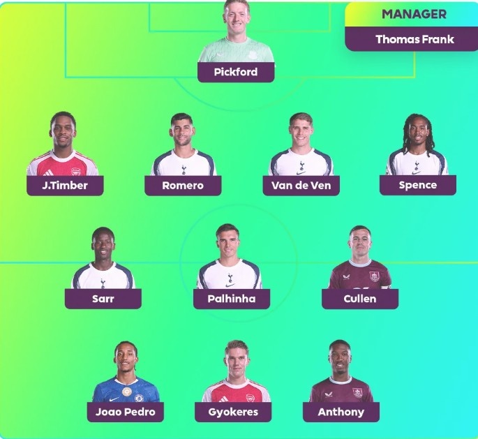 后卫:廷伯(阿森纳)、罗梅罗(热刺)、范德文(热刺)、斯宾塞(热刺)