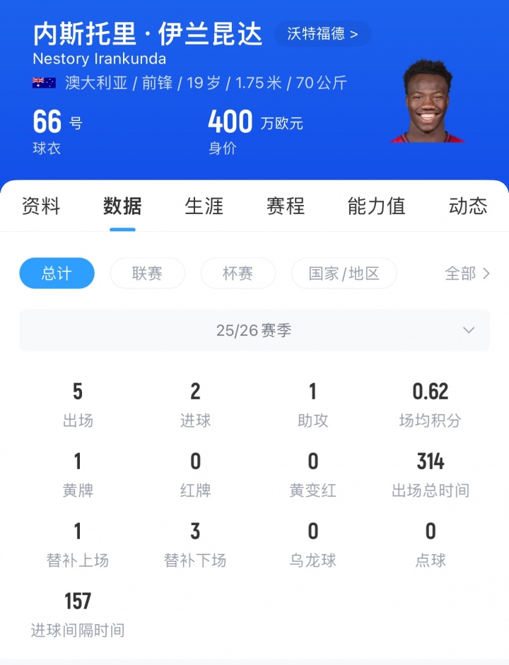 伊兰昆达现年19岁,现效率于英冠的沃特福德,本赛季已登场5次,孝顺2球1助。