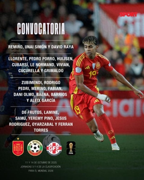 体坛周报全媒体报说念 西班牙队公布10月外洋比赛日新一期集训大名单。巴萨5东说念主入选已经第一大户,马竞4东说念主次之,阿森纳3东说念主,皇马唯有1东说念主入选。 欧洲杯夺冠主力中,尼科·威廉斯、法维安·鲁伊斯、卡瓦哈尔因伤缺席,队长莫拉塔落第原因未明。刚刚伤愈的亚马尔入选,上月巴萨曾因为对亚马尔的使用与西班牙队发生争捏。 如若不按俱乐部区分,大要巴斯克东说念主才是当今西班牙队第一自便量。包括乌奈·西蒙、雷米罗、比维安、勒诺尔芒、梅里诺、苏维门迪、奥亚萨瓦尔等7东说念主,以及......查看更多