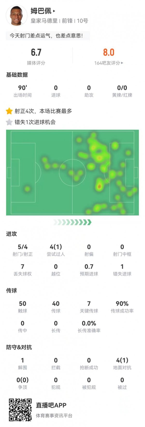 姆巴佩本场5射4正1失良机 7关节传球+4过东谈主1得手 获评6.7分