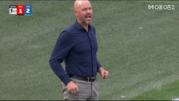 特地发火!勒沃库森连丢两球被反超,滕哈赫场边作念手势抒发发火