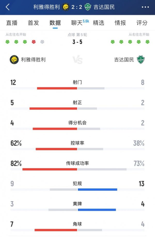 利雅得获胜vs吉达国民全场数据:射门12-8、射正5-2、得分契机4-2