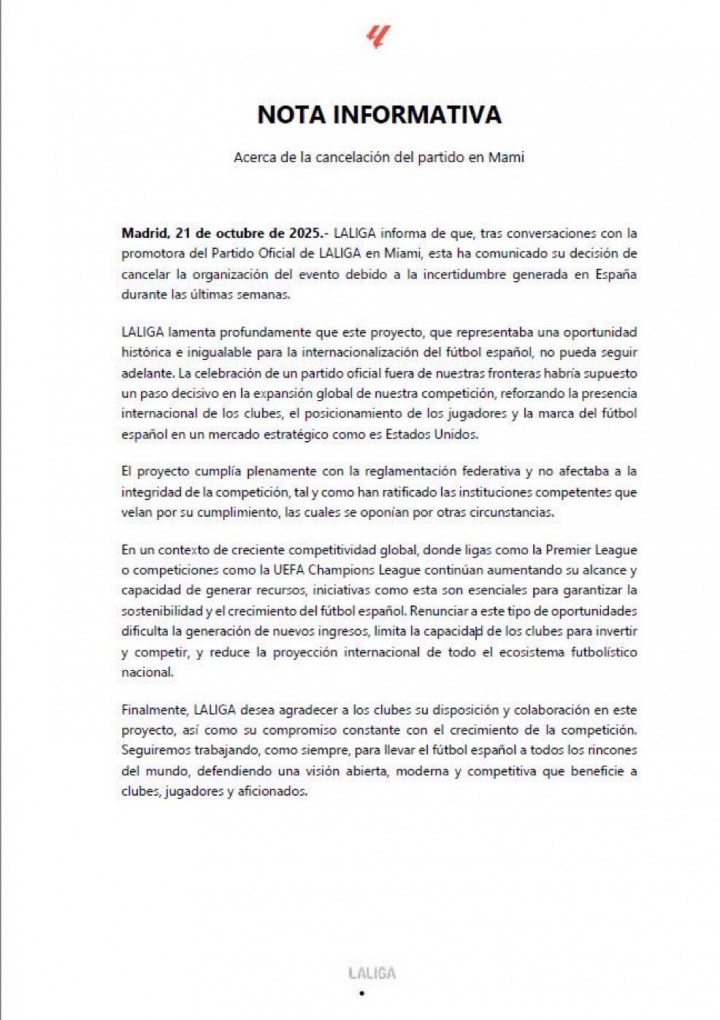 西甲定约发布声明称,经与迈阿密官方联赛赛事控制方磋磨,鉴于西班牙昔日数周内产生的不笃定性,控制方已决定取消本次赛事组织。