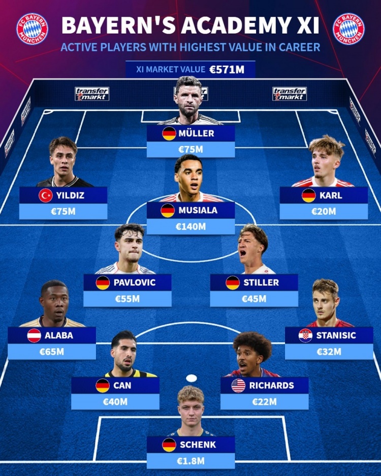 拜仁青训成立现役球员身价最高声威(取历史最高身价,总价5.71亿欧):