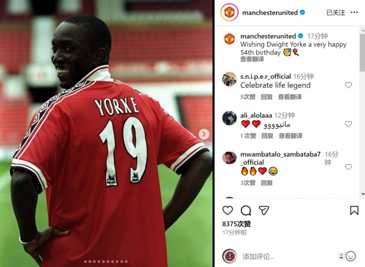 曼联官方社媒晒出约克身穿本队球衣的相片,配文:“祝德怀特-约克54岁寿辰状态。”