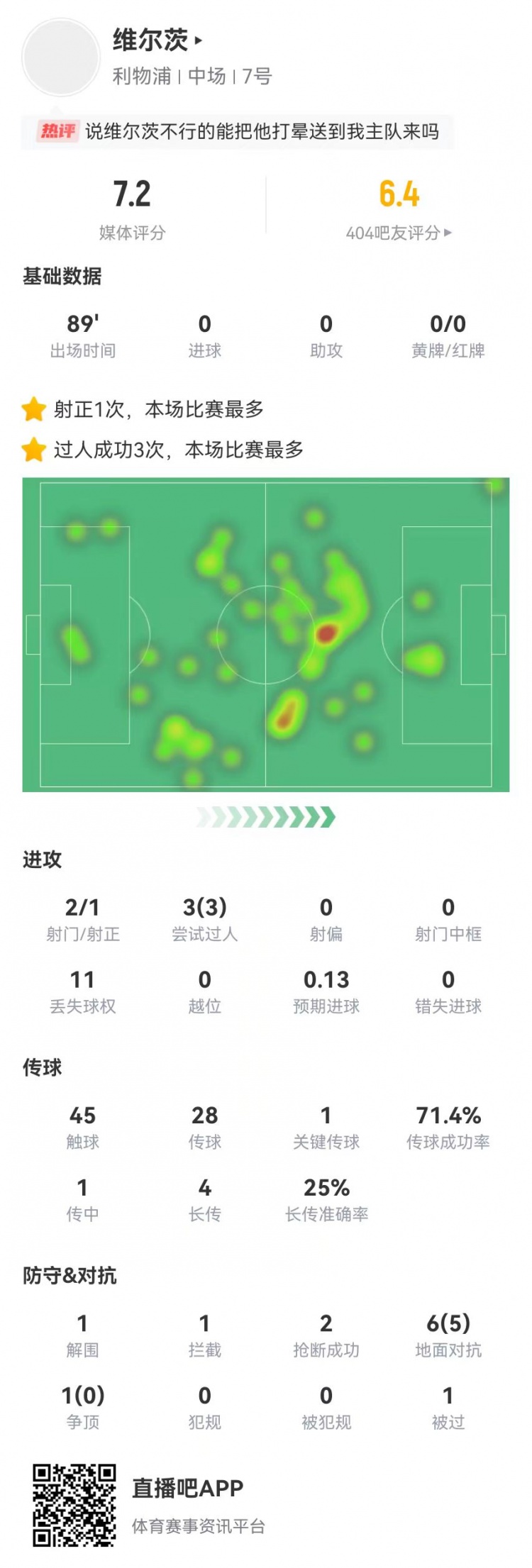 维尔茨本场2射1正+1关节传球 3过东说念主3胜仗+7叛逆5胜仗 获评7.2分
