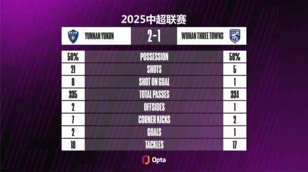 玉昆vs三镇全场数据:射门数21-5,射正数8-1,得分契机4-0