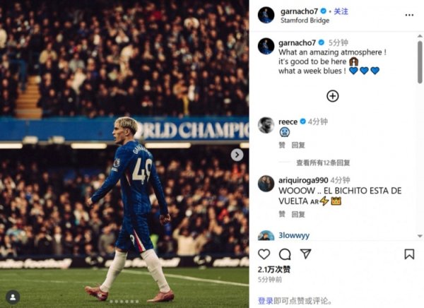 加纳乔庆祝切尔西赢球:何等棒的氛围啊,很鼎沸在这里踢球